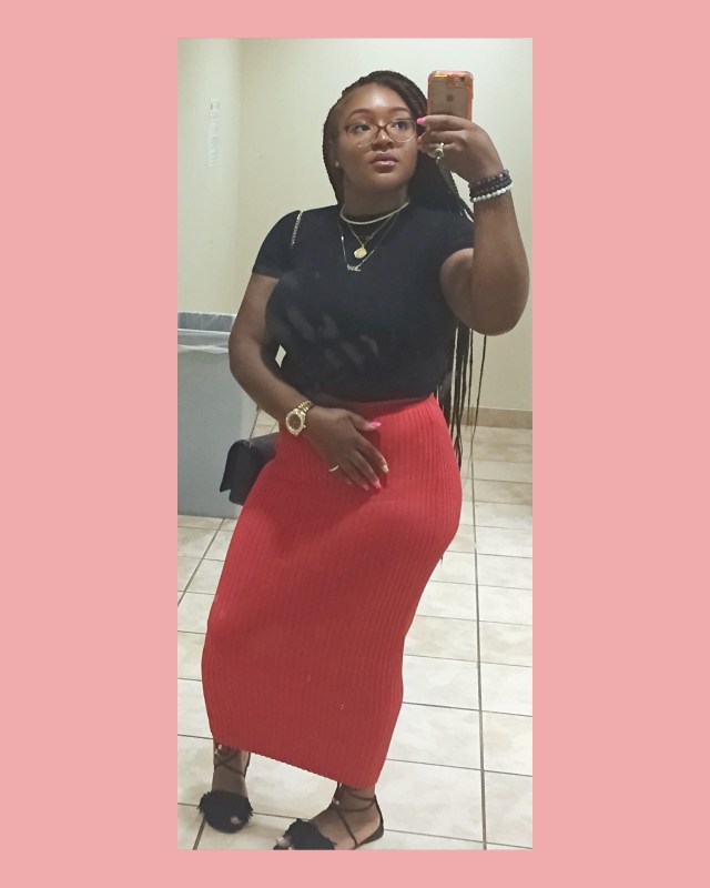 So today is a beautiful spring day in Atlanta, but you know I had to wear some variation of black. I paired a black crop top, with my long, red ribbed skirt and my lace up fringe sandals for a cohesive, effortless (somewhat conservative) look. Below is a photo and comments on where you can find everything I am wearing.